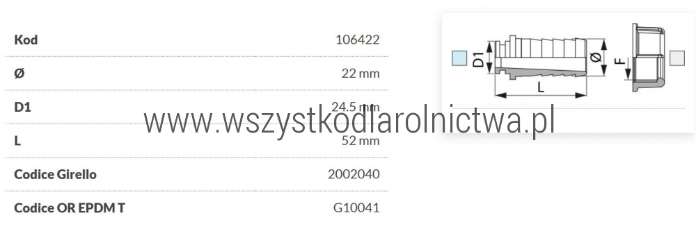106422 Przyłącze węża proste pod nakrętke nasadową z pierścieniem uszczelniającym Arag, 1" na wąż 22 mm