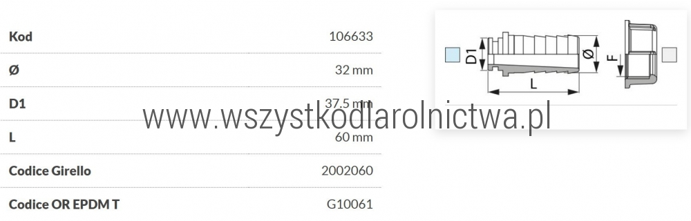 106633 Przyłącze węża proste pod nakrętke nasadową z pierścieniem uszczelniającym Arag, 1,1/2" na wąż 32 mm